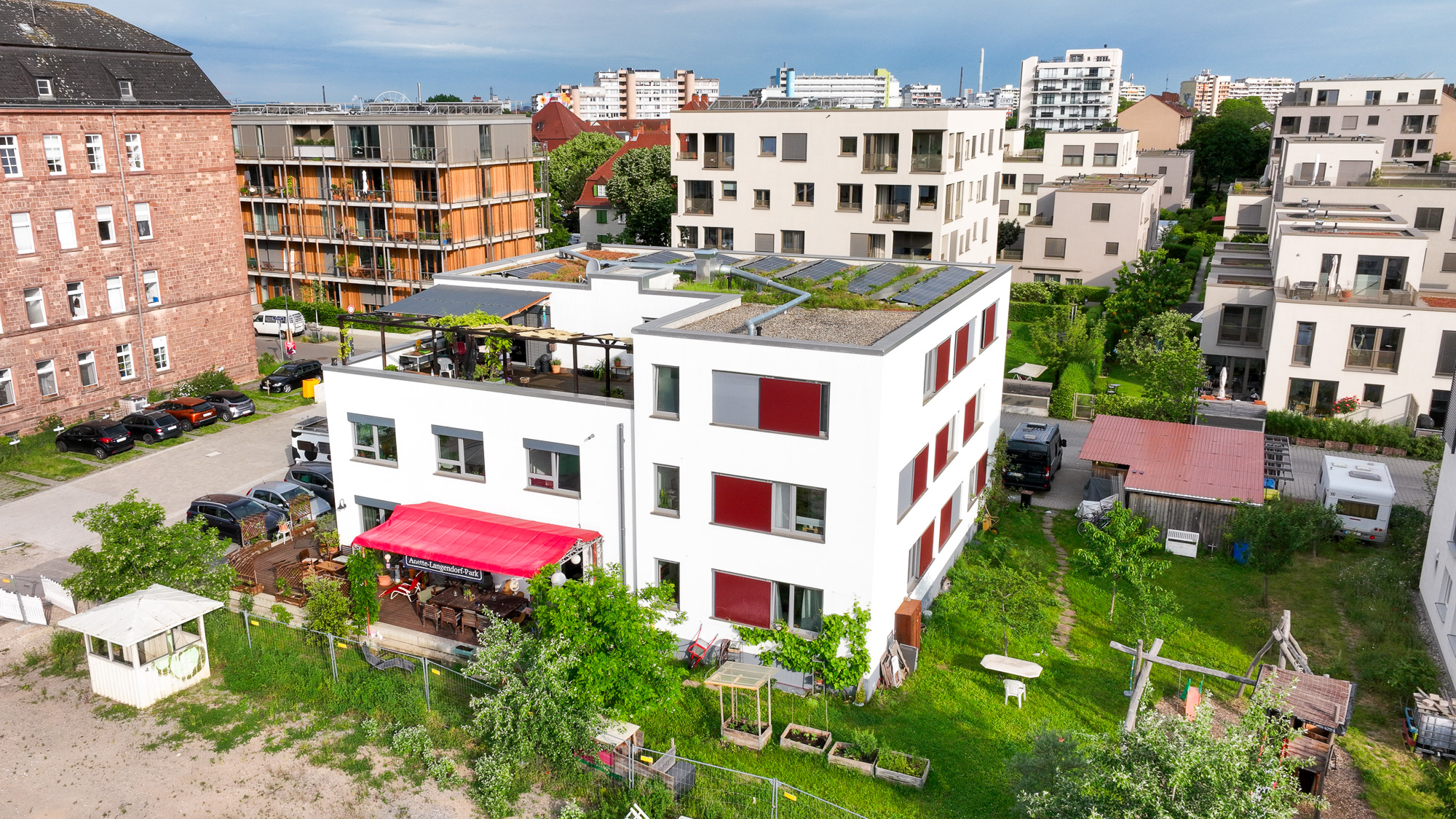 Links Wohnprojekt SWK, mitte Wohnprojekt Umbau Turley², rechts Wohnheim für Menschen mit Behinderung der Johannes Diakonie. Im Vordergrund der zukünftige Anette-Langendorf-Park