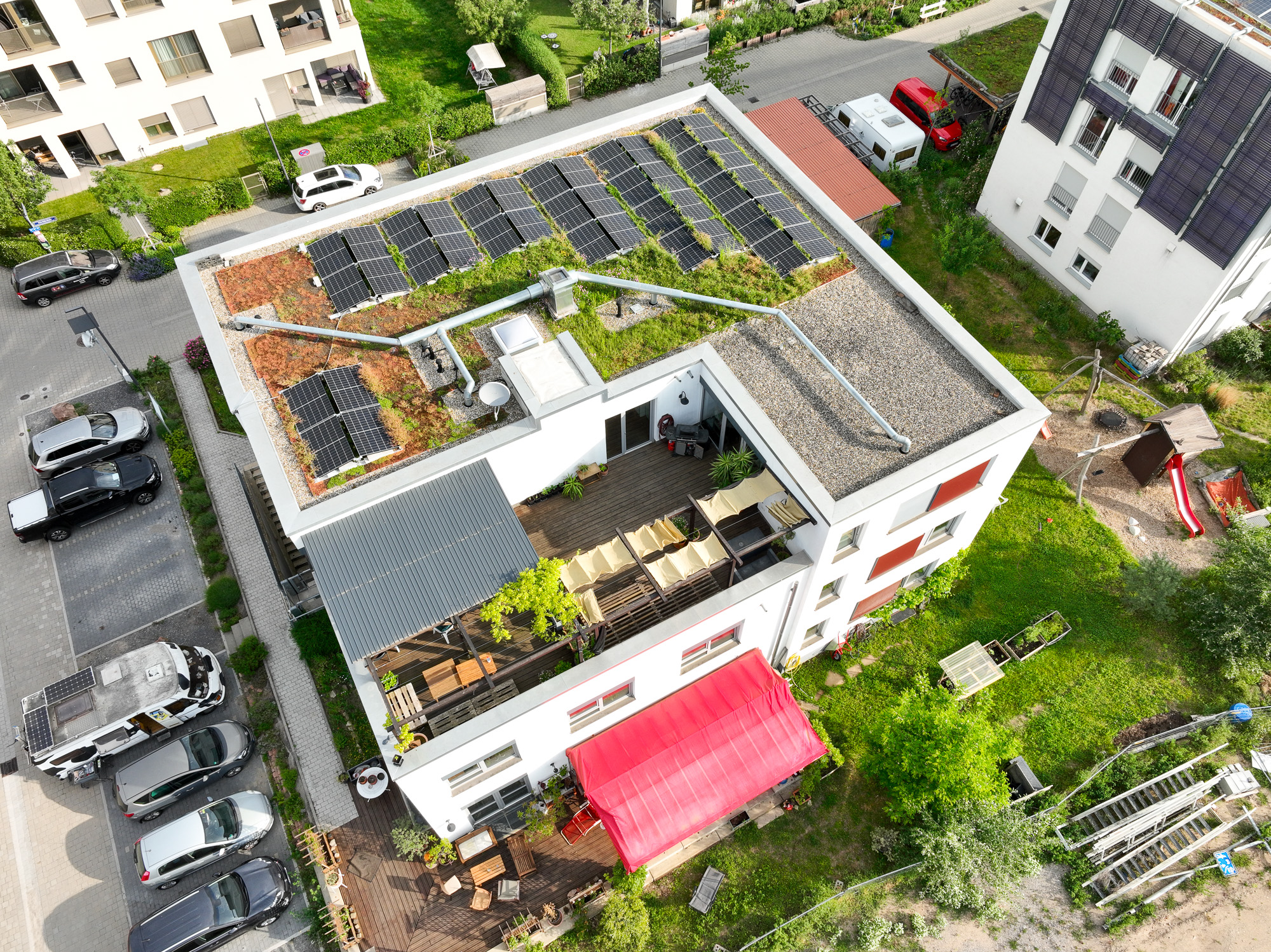 Den Bewohner*innen ist es sehr wichtig, Platz im Freien zur Verfügung zu haben. Diesem Wunsch wird gleich mehrfach entsprochen. Vor dem Haus befindet sich eine Terrasse, auf der Rückseite ein Garten mit Spielplatz (gemeinsame Nutzung mit den Nachbar*innen) und im Dachgeschoss eine ca. 80 qm große Dachterasse. Zudem grenzt das Grundstück direkt an den geplanten Quartierspark an und einen Zaun wird es nicht geben.